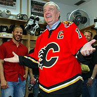 (Photo: The Prime Minister in Calgary Flames jersey when the Flames was heading toward the Cup. Jarome Iginla the Flames captain one of the bests of NHL and Team Canada member in the recent World Cup of Hockey, is seen in the photo too)